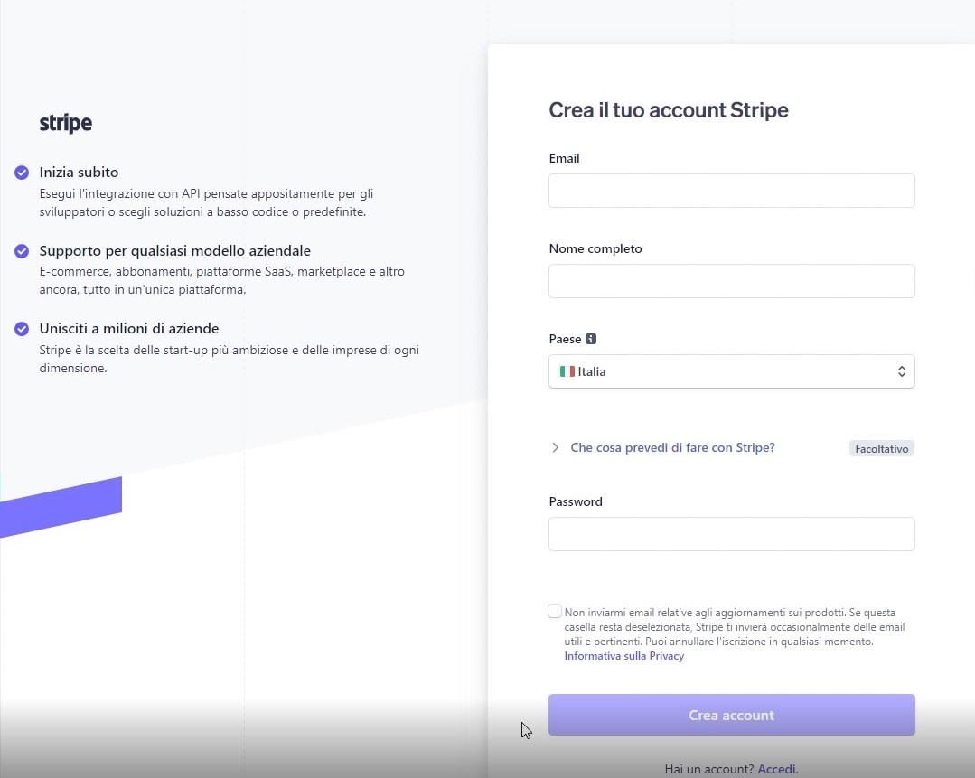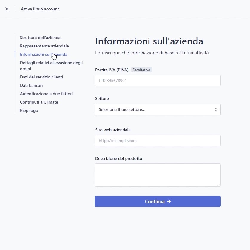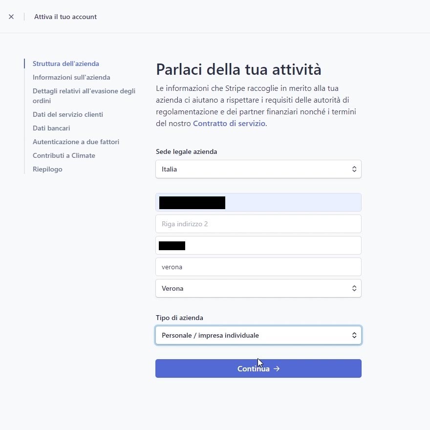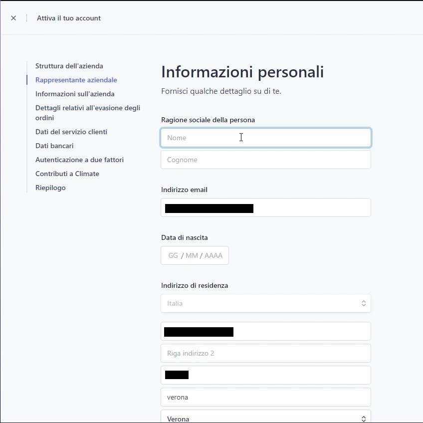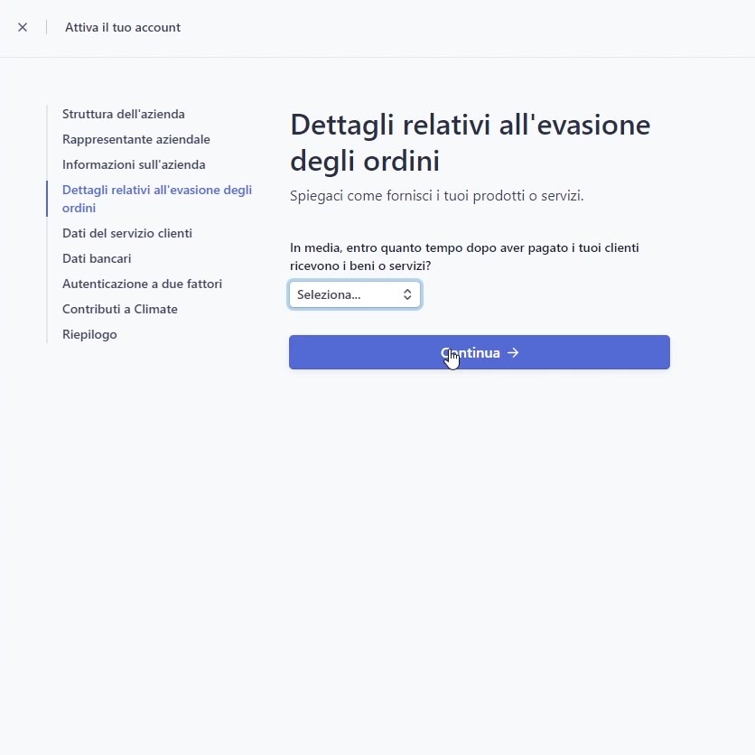 A questo punto, si procede con l'attivazione dell'account con alcune informazioni necessarie per la gestione dei pagamenti.