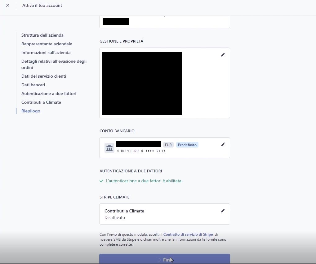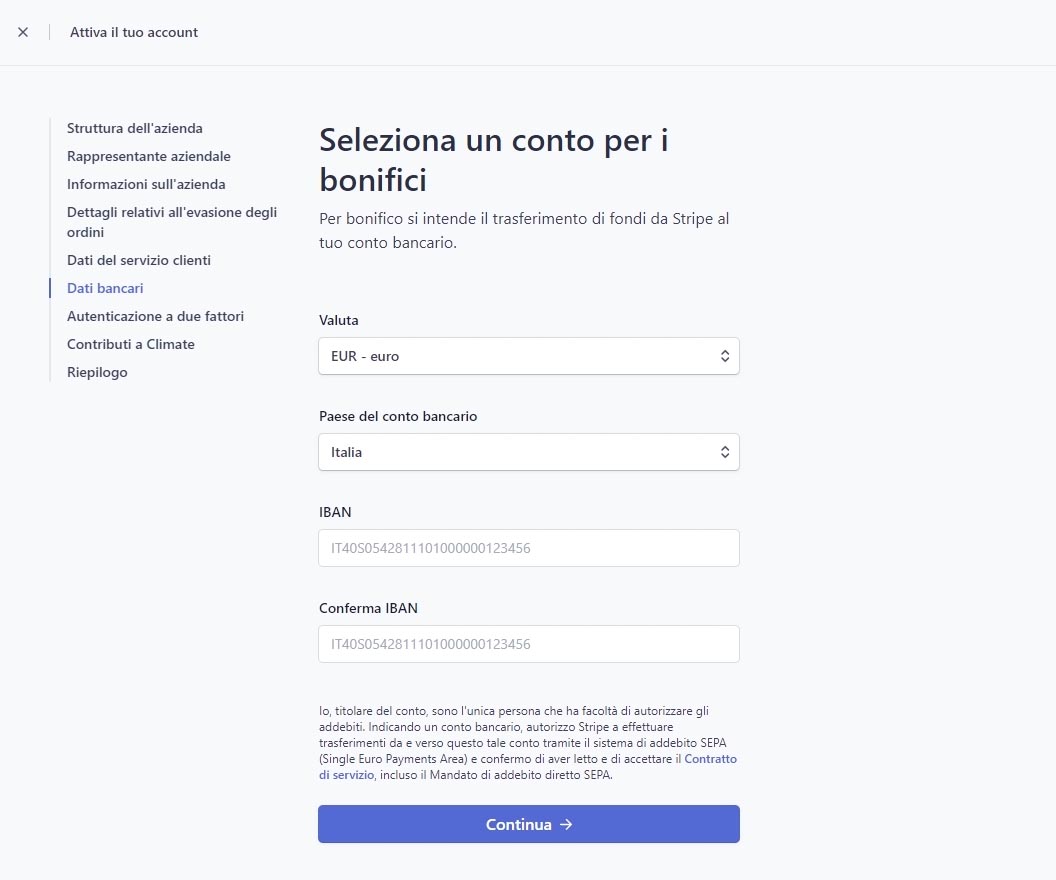 Nello step successivo invece, andremo ad impostare i dati del conto corrente aziendale per permettere il trasferimento dei fondi da Stripe all'IBAN del dealer: