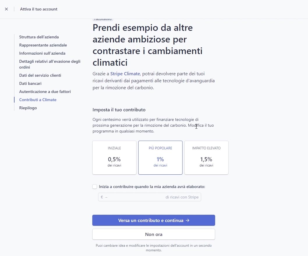 A questo punto Stripe offre la possibilità di contribuire al programma Stripe Climate, in cui la percentuale (a scelta) per ogni centesimo di transazione viene utilizzata per la ricerca di forme alternative ai combustibili fossili. E' inoltre possibile attivare questa feature al raggiungimento di una determinata soglia monetaria.