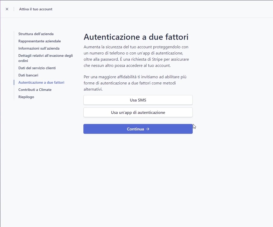 Per procedere alla validazione, sarà necessario attivare l'autenticazione a due fattori con conferma via SMS o tramite app di autenticazione: