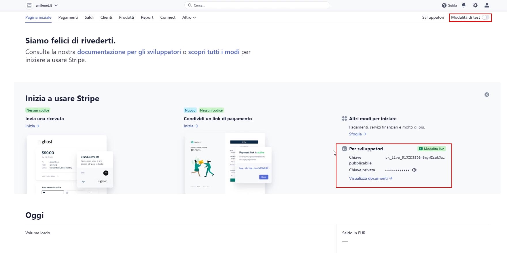 La prima coppia, denominata "modalità live" va copiata direttamente dalla dashboard nella sezione sviluppatori. Va copiata sia la chiave denominata "chiave pubblicabile" sia quella denominata "chiave privata"