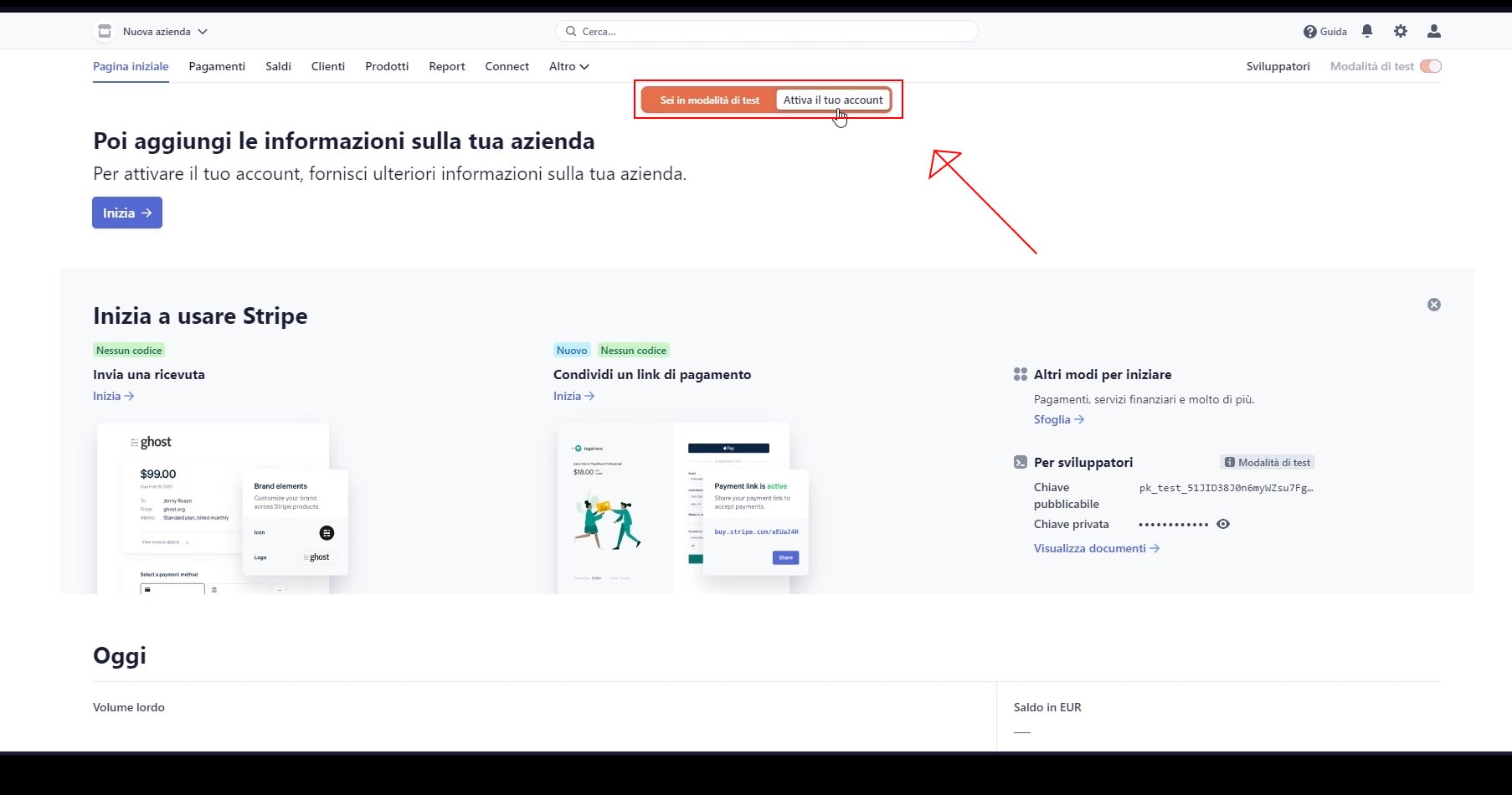 Per accedere a questa modalità, dovremmo andare ad attivare il flag posto in alto a destra denominato "modalità di test". A questo punto, vanno copiate entrambe le chiavi come sopra, ovvero "chiave pubblicabile" e "chiave privata".