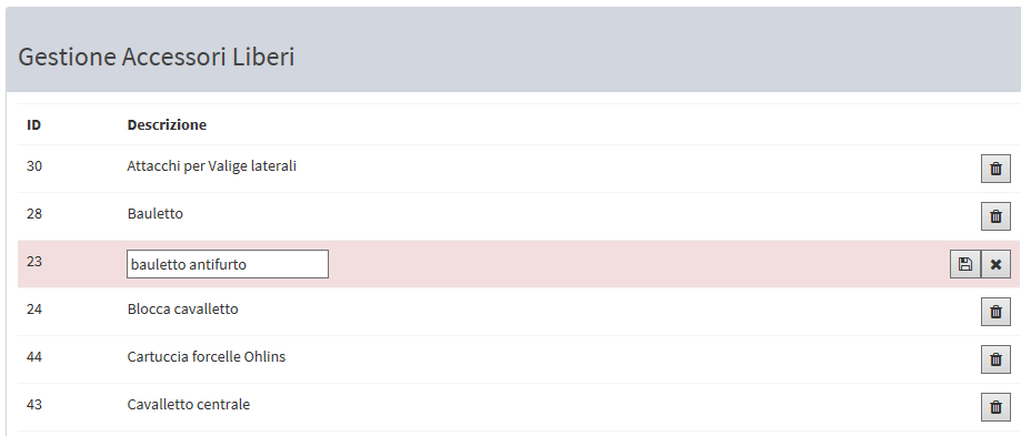 Una volta inserito un nuovo accessorio libero sarà disponibile su tutte le schede presenti per poter eventualmente essere flaggato.