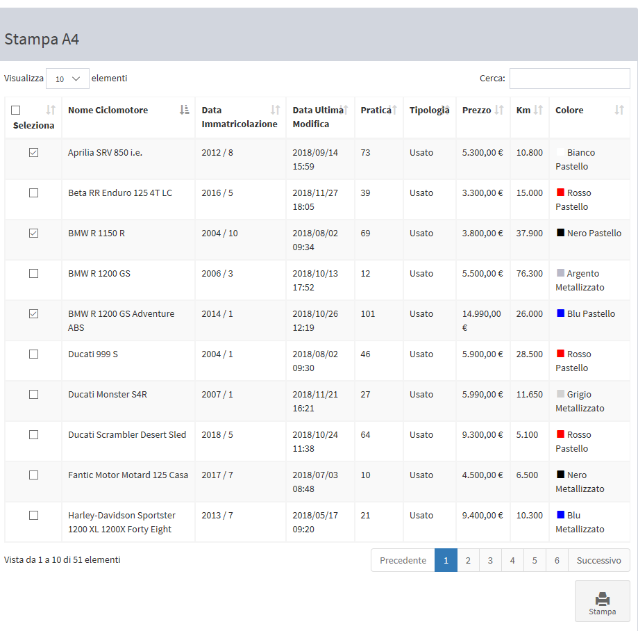 A richiesta, è possibile avere la possibilità di inviare a un portale lo stock completo delle moto oppure un sottoinsieme scelto tramite checkbox dall’utente. I flag per abilitare la pubblicazione sono presenti sia nelle schede motociclo, sia alla ...