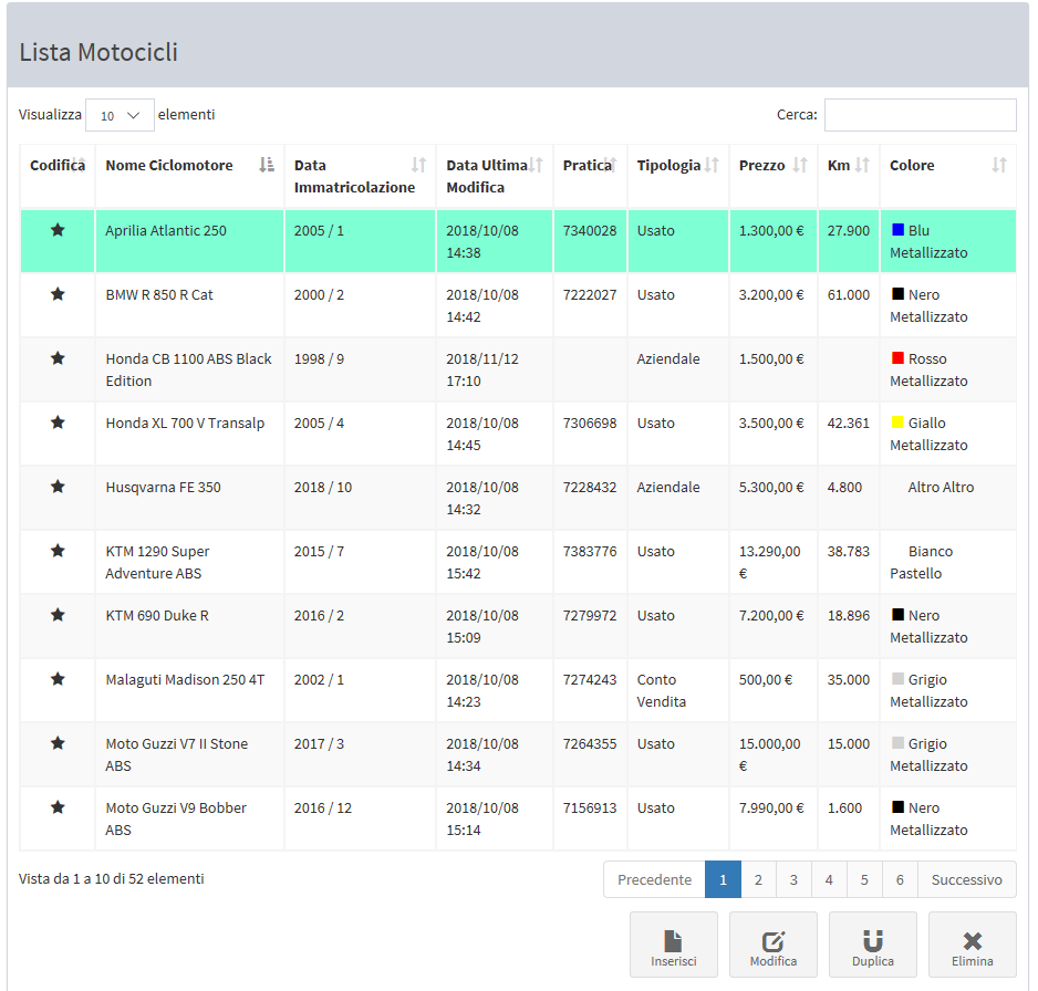 Cliccando sul nome di un Motociclo ed eliminando la scheda la scheda viene spostata nella Lista Motocicli Eliminati. A quel punto la scheda è virtualmente eliminata e quindi non viene più inviata al sito e ai vari portali. Le schede eliminate saranno ...