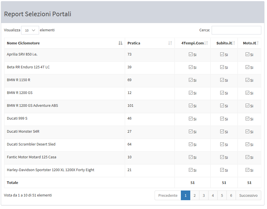 A richiesta, è possibile avere la possibilità di inviare a un portale lo stock completo delle moto oppure un sottoinsieme scelto tramite checkbox dall’utente.